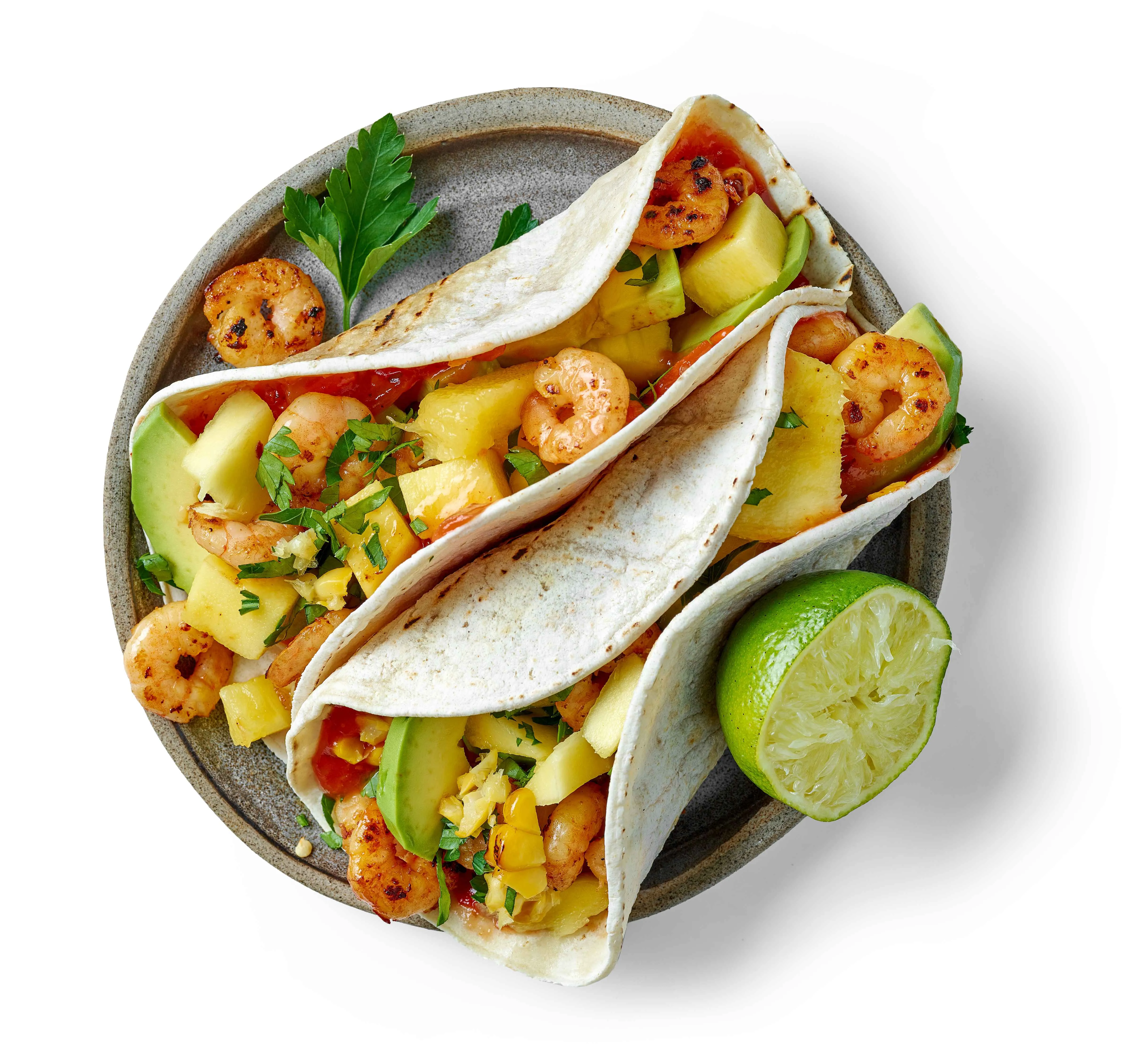 Three With Corn Tortillas Filled With Choice Of Grilled Shrimp Or Fish Topped With Cabbage, Jack Cheese, Cilantro. Avocado And Chipotle Mayo Served With Rice, Refried Beans And Salad