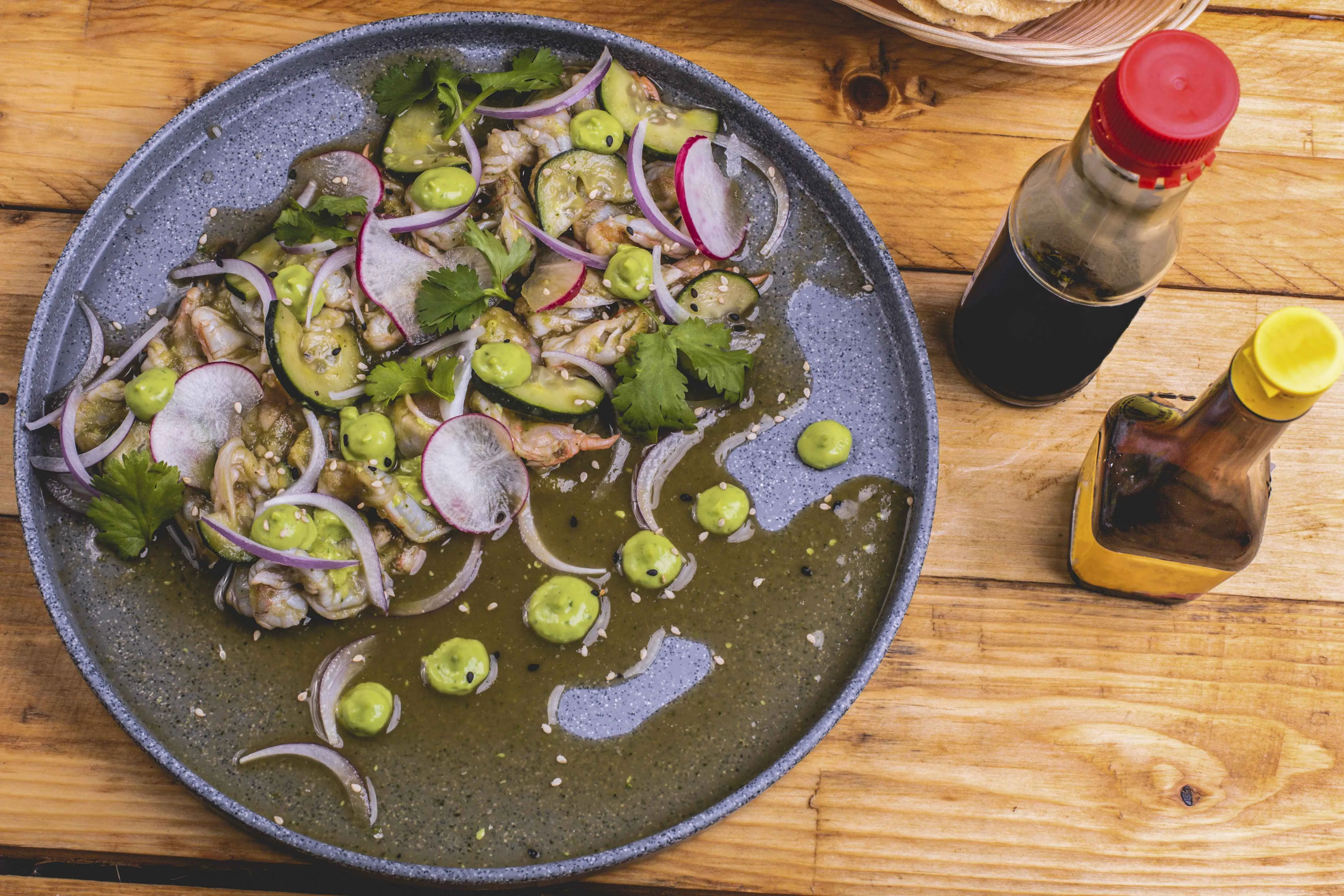 Shrimp Marinated In A Lime Juice With Habanero Peppers And Spices Served With Cucumber And Purple Onion Rings